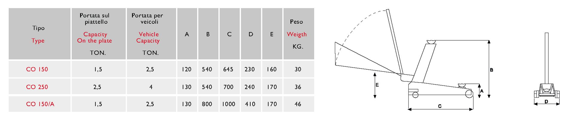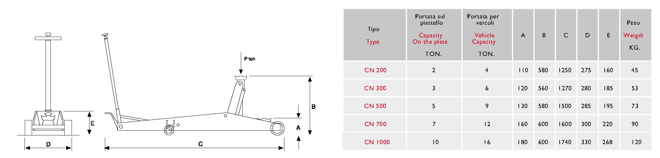 Una serie completa di sollevatori idraulici a carrello per soddisfare qualsiasi esigenza di sollevamento. Struttura solida e robusta, appoggiata su quattro ruote, due direttrici, e due piroettanti, garantiscono una estrema stabilità in tutte le posizioni di lavoro, ed una eccezionale maneggevolezza. Tutti i modelli sono dotati di pedale di avvicinamento rapido, di manico smontabile per facilitare il trasporto, e di valvola di fine corsa automatica e valvola di sovraccarico. A richiesta, i modelli fino a 5 ton di portata possono essere forniti con ruote in nylon o in wulkollan.